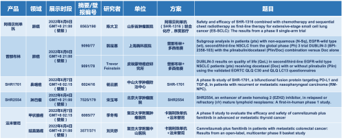 2022 ASCO年会另有5款尊龙凯时医药上市前抗肿瘤创新药的相关研究被接收为壁报,包括SHR-1316、普那布林、法米替尼、SHR-1701和SHR2554,他们的单药或联合方案相关7项研究被接收为壁报,覆盖肺癌、鼻咽癌、淋巴瘤、甲状腺癌和结直肠癌等领域。